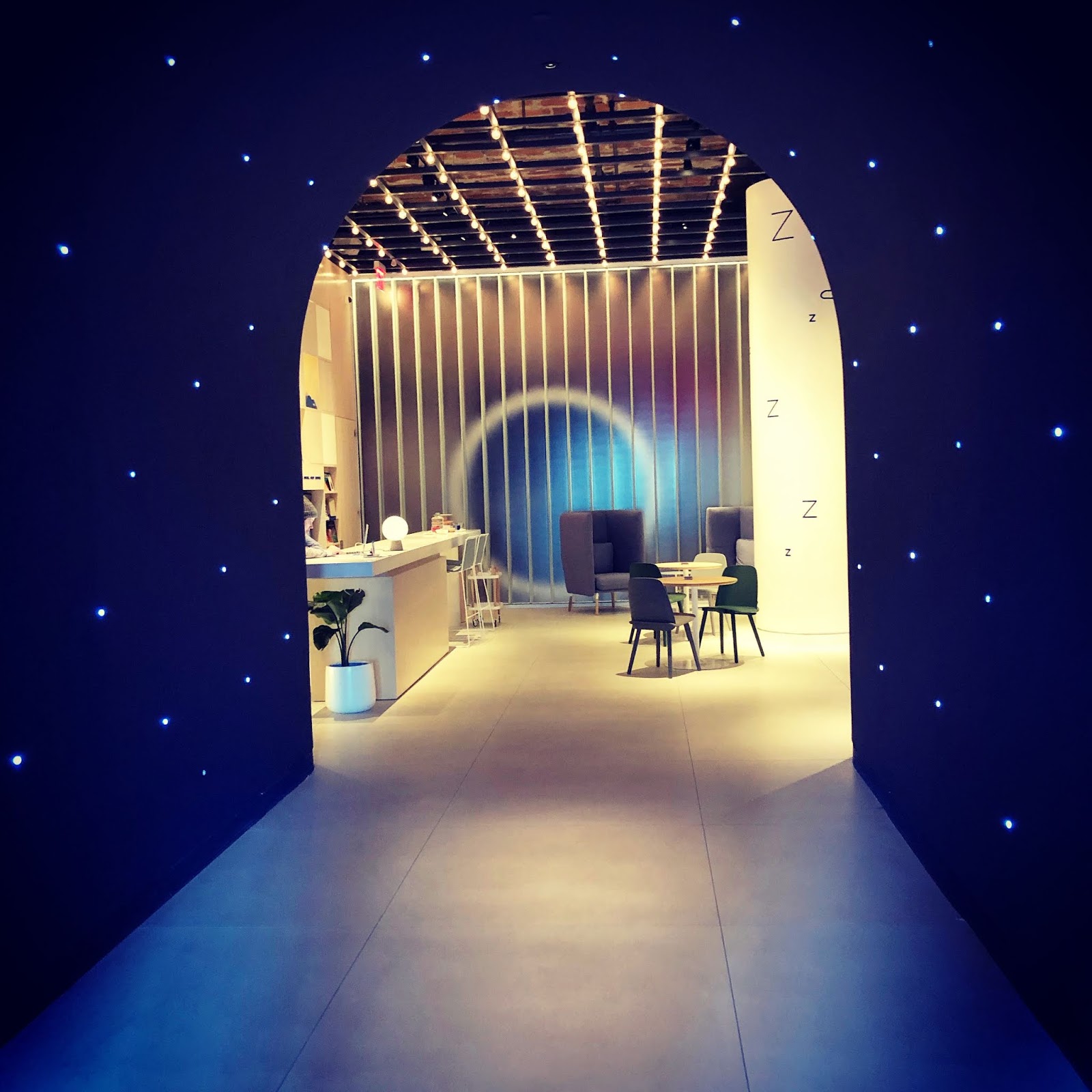 You enter through a starry tunnel, where nap concierges in pajama tops greet you: “Have you napped with us before?” There are seating areas, bowls of nuts and saltwater taffy, a cooler of La Croix and Chameleon Cold Brew, and a shelf of boring books if you need performance enhancement. More-provocative books, like The Anatomy of Sheds and The Rise of David Bowie, are on unreachable shelves above the check-in desk.