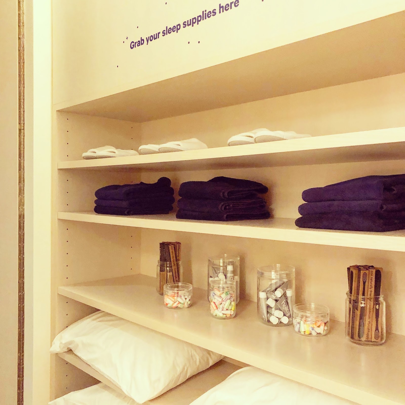 The changing area is, admittedly, distracting. On the day I visited, “Put Your Hands Up” pumping through the speakers had me reaching for the array of complimentary amenities, including stylish earplugs (who knew there was such a thing?), Hello charcoal-bristle toothbrushes and toothpaste, Sunday Riley serums and cleansers for pre- and post-nap, and extra pillows and towels. There are lockers and curtained rooms with sinks where you can slip into your loaner Sleepy Jones constellation-print pajamas and slippers. You could spend half an hour prepping for your nap.