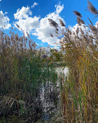 A four-pointed buck leaped out of the woods, stared at me, and disappeared, too fast for me to take a photo. Was it a ghost? Against the autumn sky, the phragmite stalks waved in the wind.