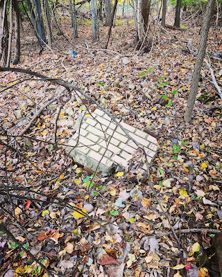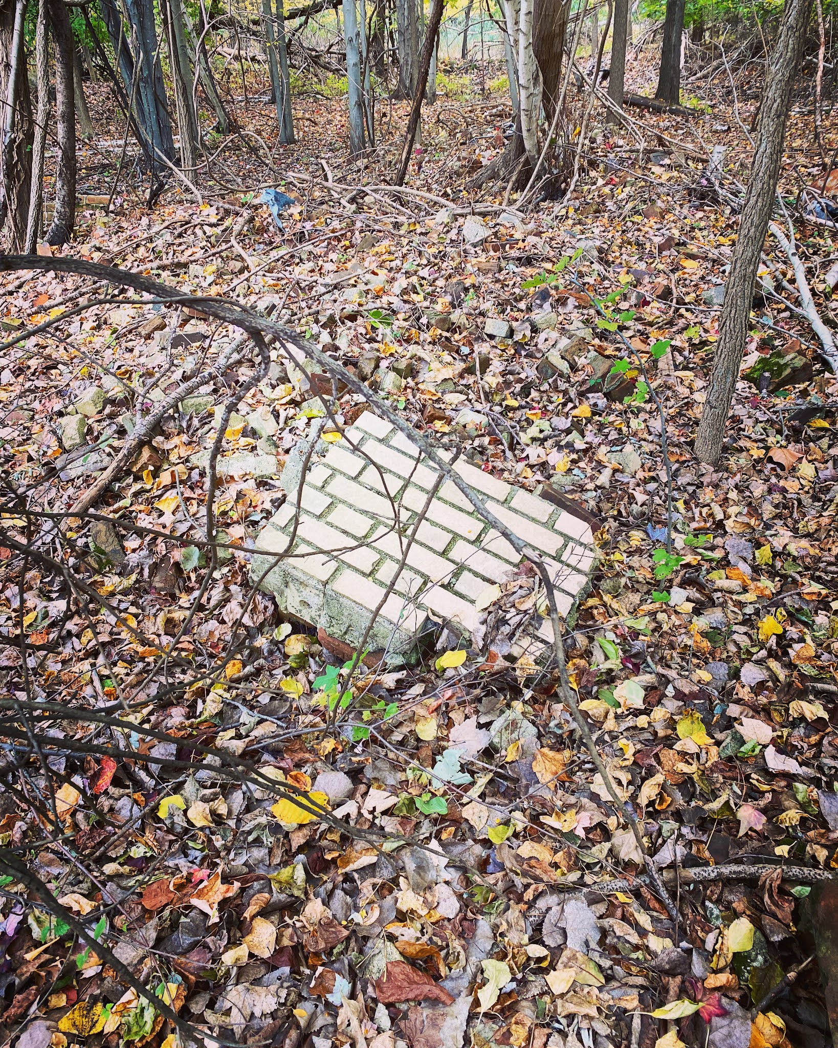 A section of brick wall lay atop the fallen leaves as if dropped from above.