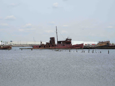 Just before I left, I saw a rubber raft with an outboard motor puttering among the ships, and then a shiny red tugboat streamed past, its fresh white wake splashing up against the rusted shells of its ancestors.
