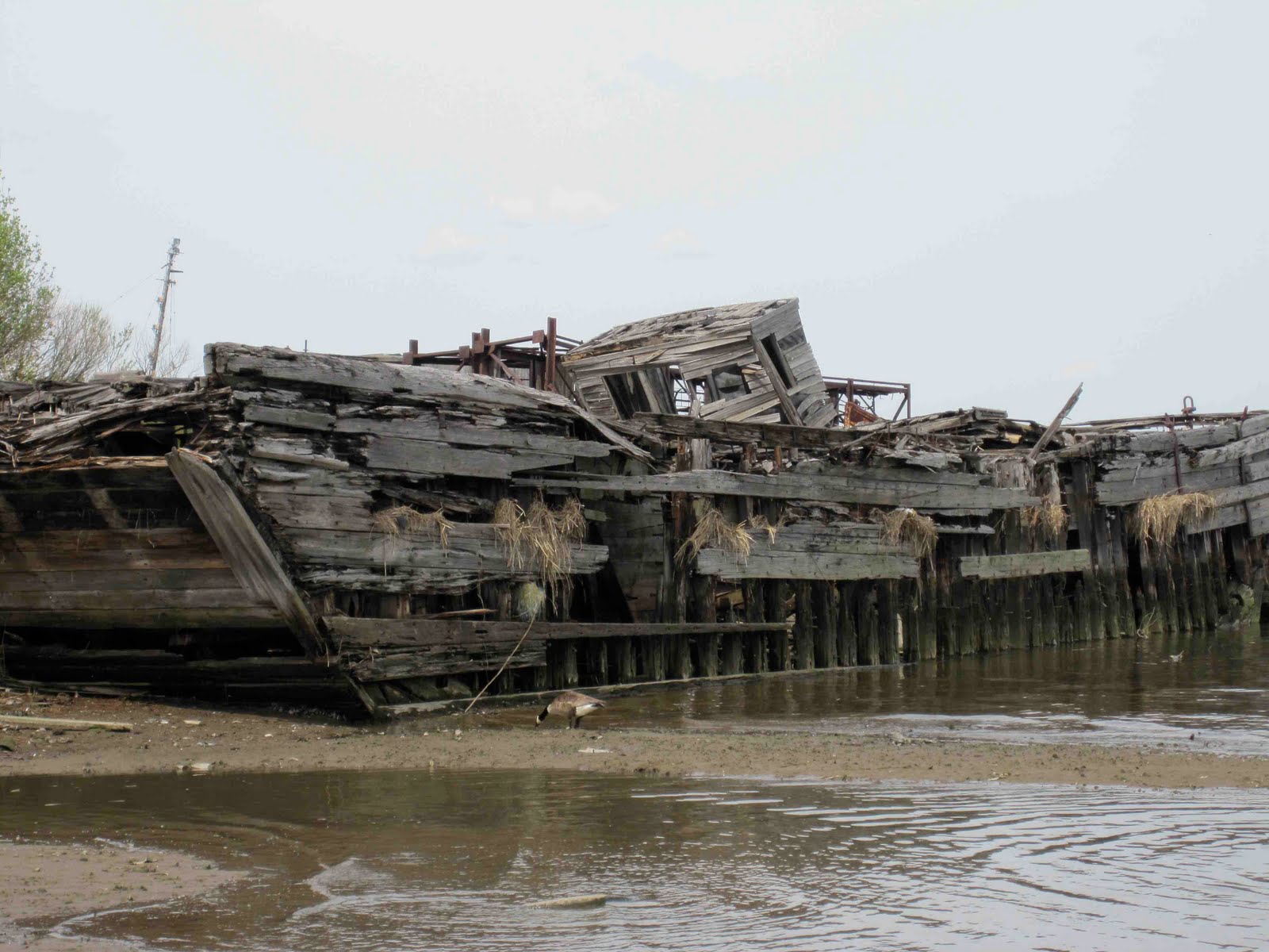After donning tall rubber boots, I pushed my way through the grasses, teetering across landfill sludge—Santa hats, flyswatters, shampoo bottles—on ancient ship beams studded with nine-inch rusty nails. The air smelled like sulfur and stagnant mud. In the distance, spring birds twittered over the rush of the West Shore Expressway. In the rippling water, Canadian geese drifted between empty shells of ships sunk in the mud. Their hulls canted to port and starboard; portholes pointed toward the sky. Splintered wooden wheelhouses toppled onto decks, where crusty cleats held limp bowlines strewn with algae. In some places the hulls were paper thin, almost lacy, and the metal curled at the edges; one could imagine it rustling and tinkling in the wind. Gears, pulleys, and capstans clung to the decks of the ferryboats, tugboats, barges, and fishing boats like desperate sailors on a stormy sea, only the waters here were so stagnant that I spotted a few mussel colonies growing in the shallows.