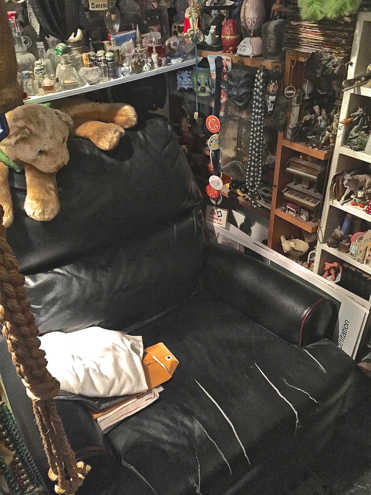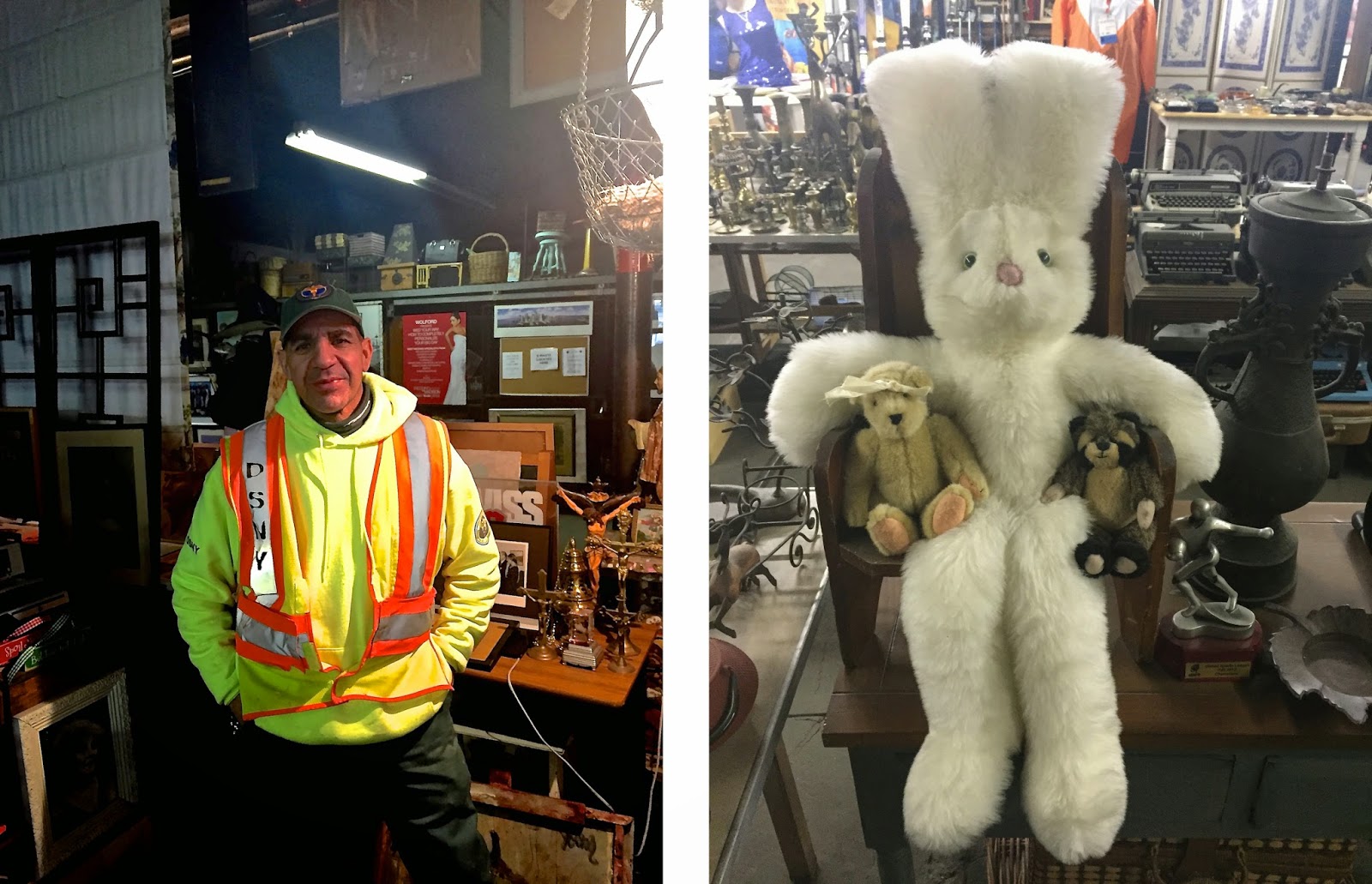 Molina began finding treasure in the trash at age nine. “We didn’t get too many gifts,” he said of his childhood in the East Harlem projects, so he learned to fix things he found that were broken. Over the years, he developed an eye for diamonds in the rough, which he tucks into a vestigial side bin on the sanitation trucks during his route. As soon as he finds, say, a toy frog in ballet slippers, he can envision where he’ll put it. After he signs out at 1.45 pm each day, he comes up here and dusts, rearranges, makes small repairs, finds a home for the day’s treasure, and sometimes consults his logbook.