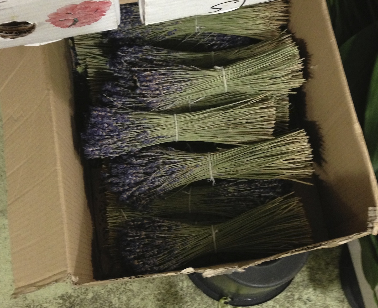 Daffodils rest supine, not yet bloomed, in a box. Lavender bundles exude a dry, heathery aroma from beneath a metal shelf. Vats of tulips burst from their wrappers beneath vases of early spring branches. Ranunculus buds rest their heads on a bed of shredded paper. Calla lilies—one of the few unbundled blooms—tempt passing noses with the flute of their single white petal.